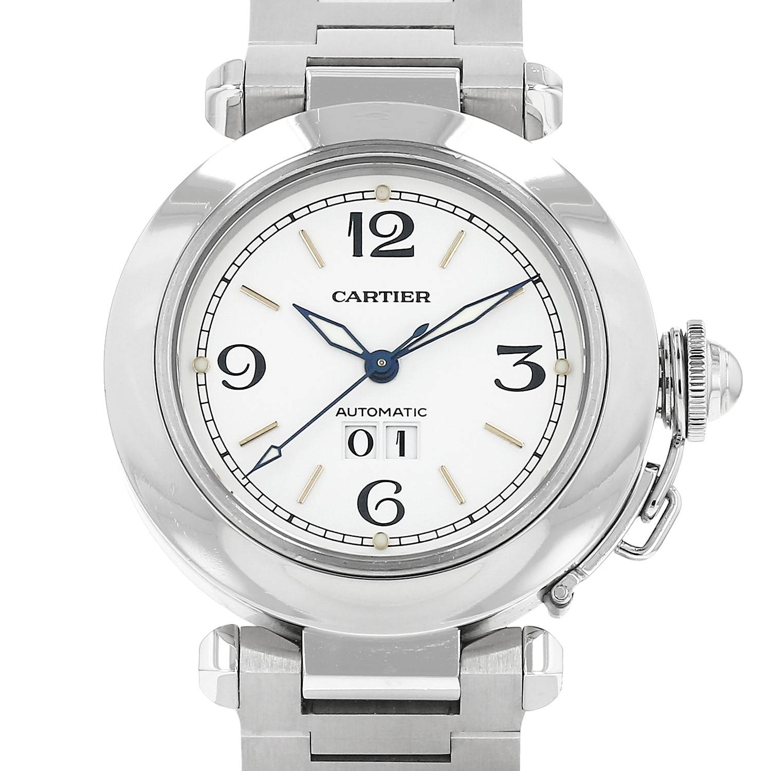 Stainless steel Cartier Pasha wristwatch. Round case in stainless steel, screwed caseback, screwed crown protection.