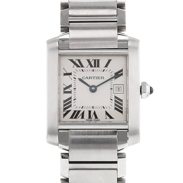 Stainless steel Cartier Tank Française lady's wristwatch. Rectangular case in stainless steel, screwed caseback, crown set with a sapphire cabochon .