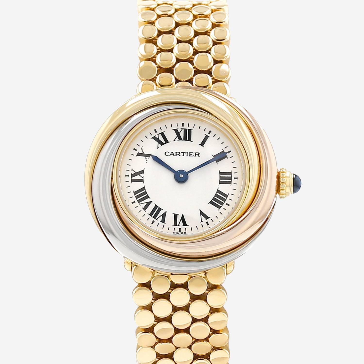 3 Golds Cartier Cartier Trinity wristwatch. 3 Golds round case, screwed caseback, canned crown set with a sapphire cabochon.