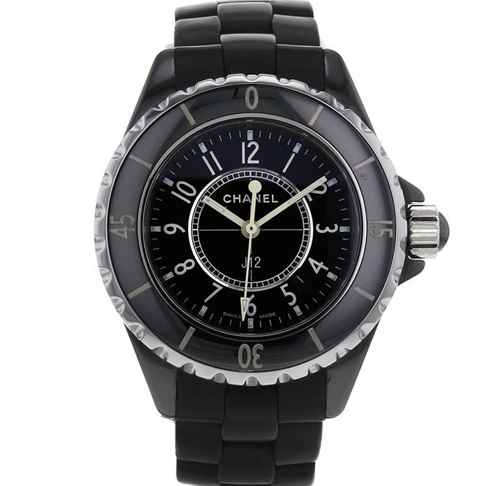 Nice black ceramic stainless steel Chanel J12 lady's wristwatch. Round case in stainless steel, screwed caseback, directional graduating rotating bezel, screw-down crown.
