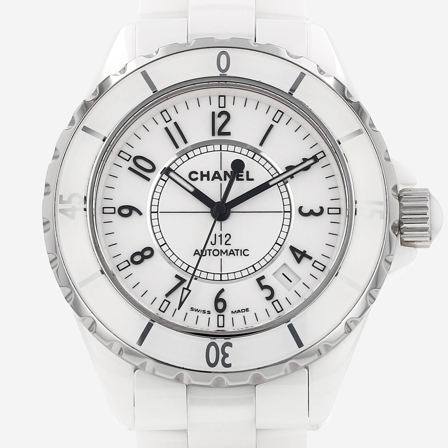 Ceramic and stainless steel Chanel J12 wristwatch. Round case in ceramic, screwed caseback, directional graduating rotating bezel, screw-down crown set with a cabochon.