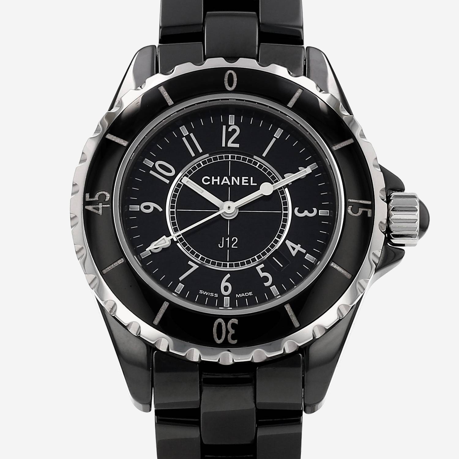 Ceramic and stainless steel Chanel J12 wristwatch. Round case in ceramic, screwed caseback, directional graduating rotating bezel, screw-down crown set with a black sapphire cabochon.