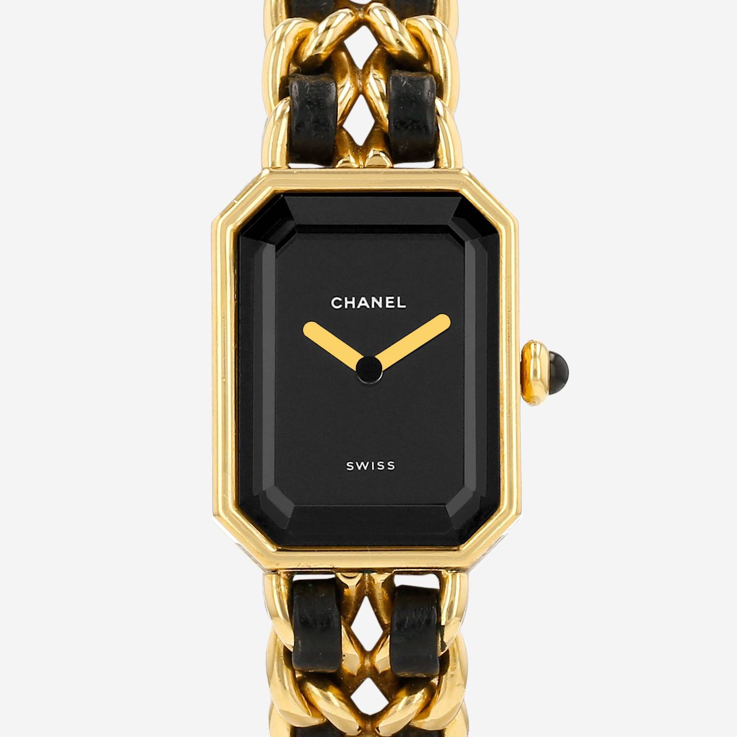 Gold plated Chanel Première wristwatch size M. Octogonal case in gold plated with faceted glass, clipped caseback, crown set with a black sapphire cabochon.