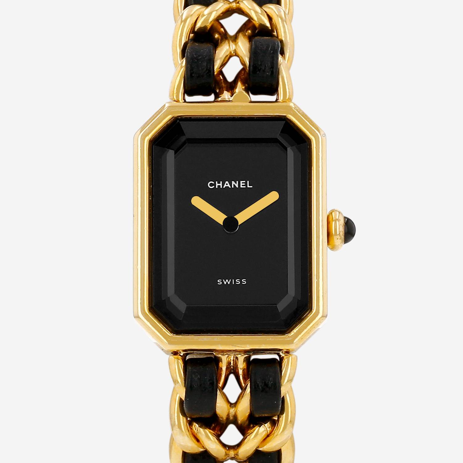 Gold plated Chanel Première wristwatch size XL. Octogonal case in gold plated with faceted glass, clipped caseback, crown set with a black sapphire cabochon.