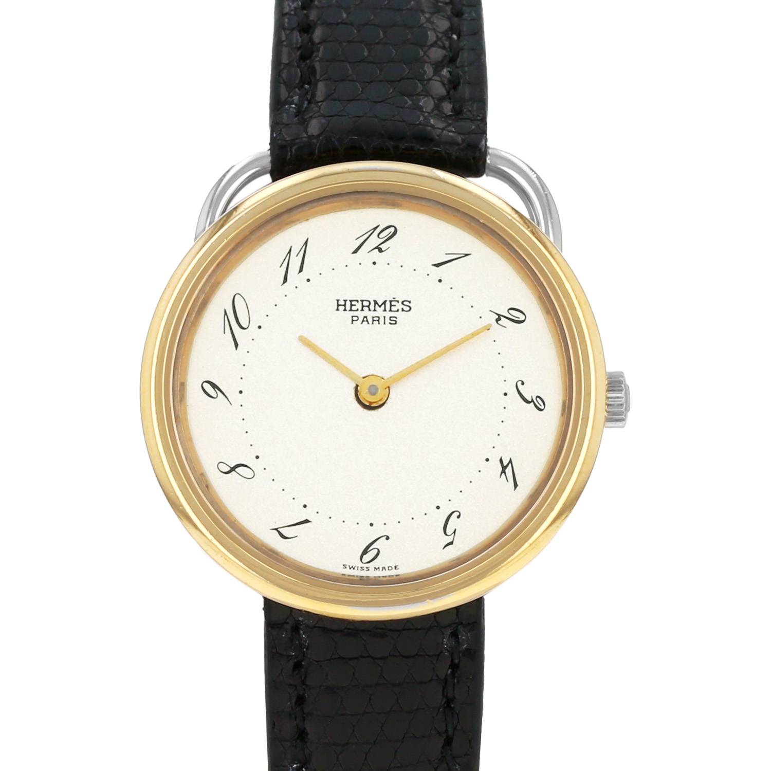 Gold plated and stainless steel Hermès Arceau wristwatch. Round case in stainless steel, clipped caseback, gold plated smooth bezel, canned crown.