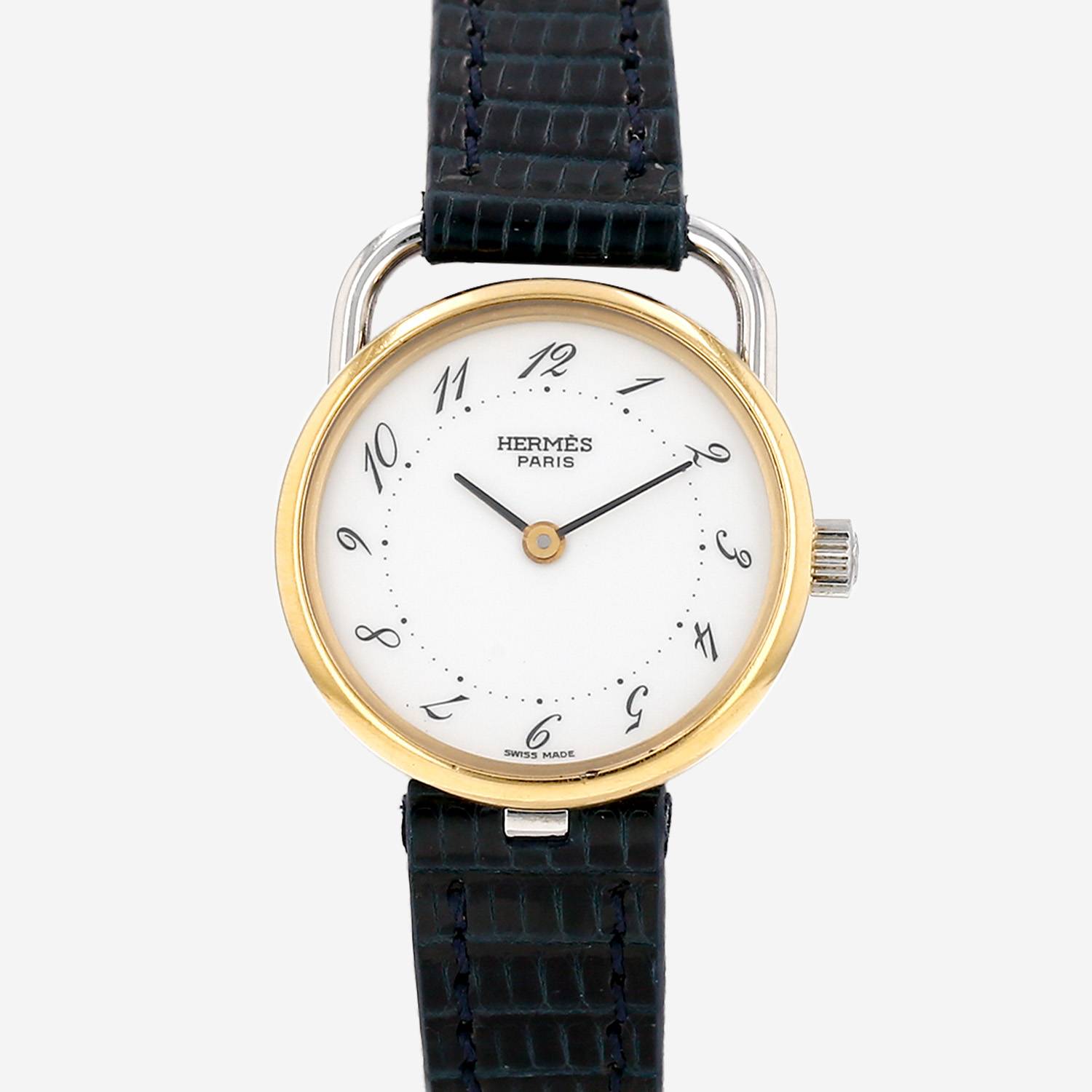 Gold plated and stainless steel Hermès Arceau wristwatch. Round case in stainless steel, clipped caseback, gold plated smooth bezel, canned crown.