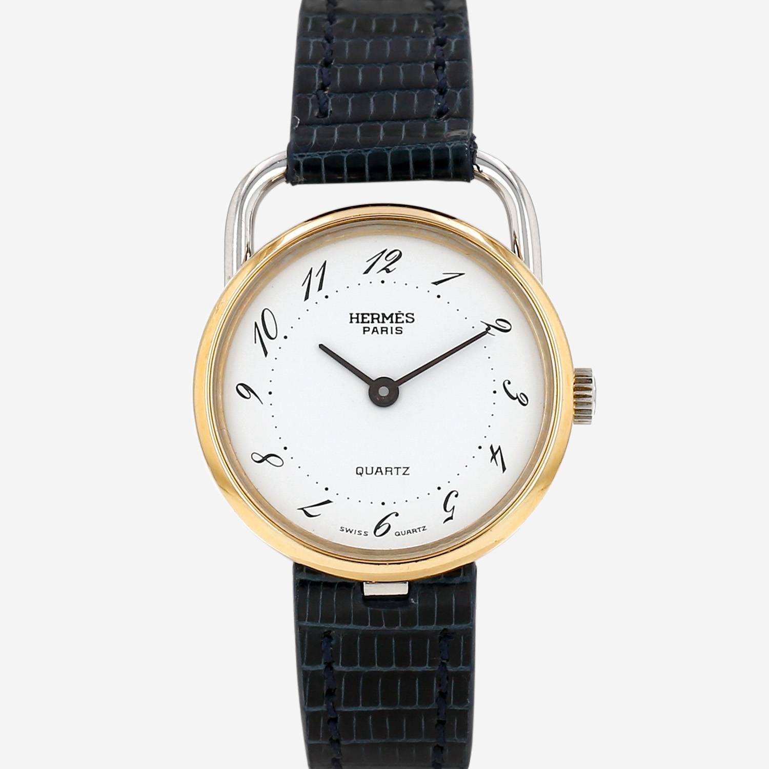 Gold plated and stainless steel Hermès Arceau wristwatch. Round case in stainless steel, clipped caseback, gold plated smooth bezel, canned crown.