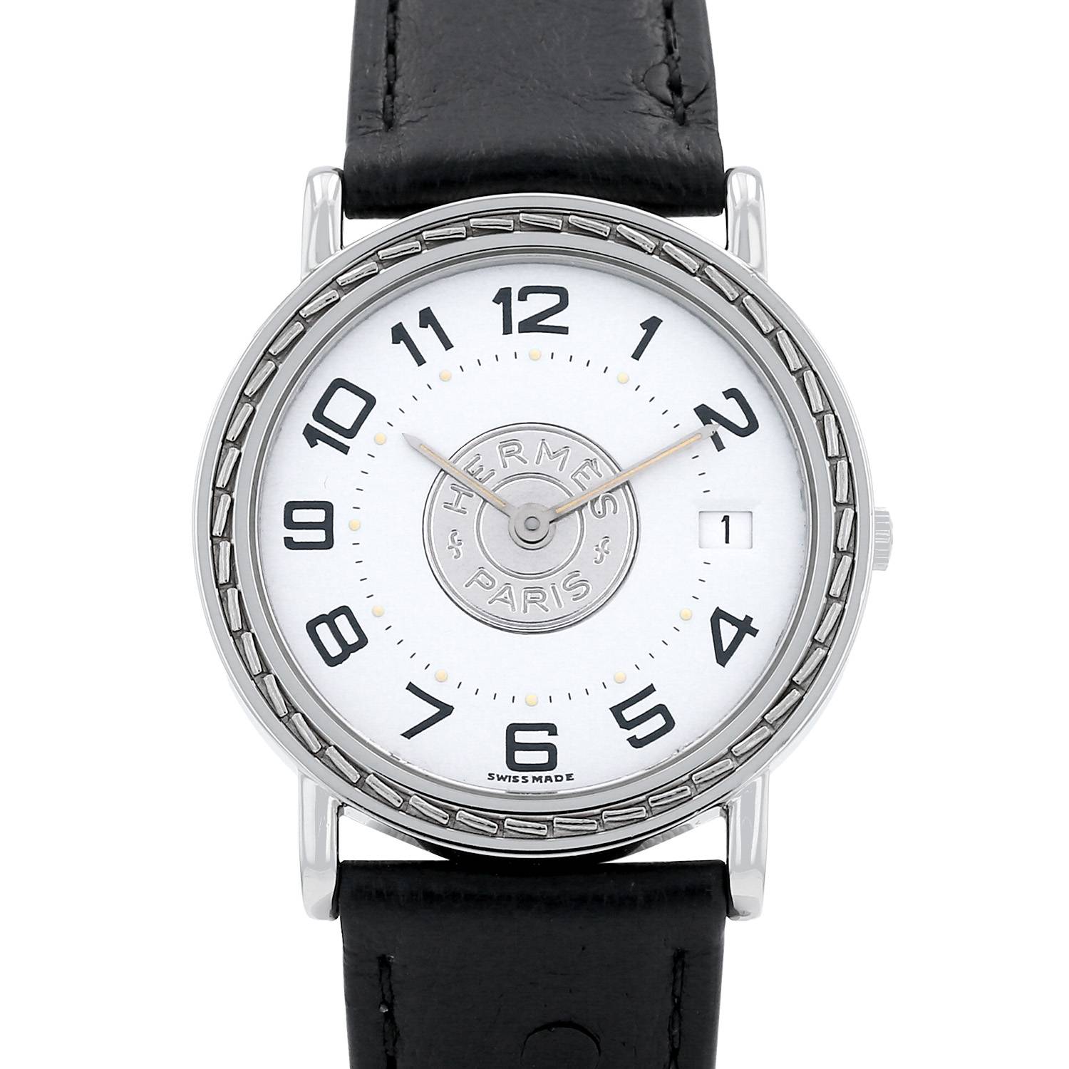 Stainless steel Hermès Sellier wristwatch. Round case in stainless steel, clipped caseback, canned crown.