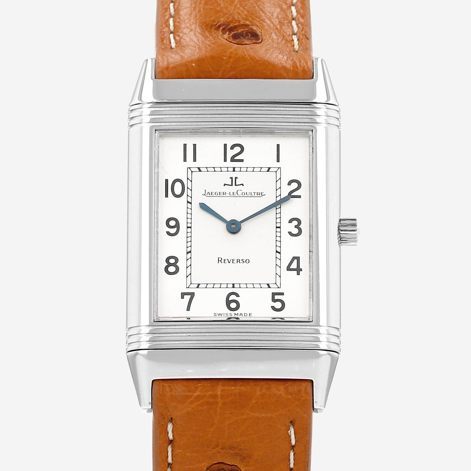 Stainless steel Jaeger-LeCoultre Reverso wristwatch. Rectangular case in stainless steel reversible with triple godron, screwed caseback, canned crown.