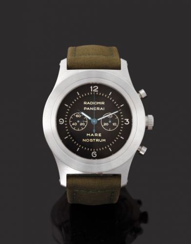 Description : Lot Description.Panerai. An extremely rare, large and historically interesting stainless steel prototype of a waterproof chronograph wristwatch.Signed Panerai, Radiomir, Mare Nostrum, manufactured in 1943.With circular nickel-finished jewelled lever movement, monometallic balance, the dial consisting of two discs, the lower one coated with Luminor luminous substance visible through the cut out Arabic and baton numerals in the black upper disc, luminous hands, sunk centrefield with two punched white subsidiary dials indicating constant seconds and 45 minutes register, in large tonneau-shaped water-resistant-type case with revolving blank bezel, screw back and screw down crown, two round chronograph buttons in the band, dial signed.52 mm. wide.View Lot Notes ›Read our expert's descriptionPanerai. An extremely rare, large and historically interesting stainless steel prototype of a waterproof chronograph wristwatch