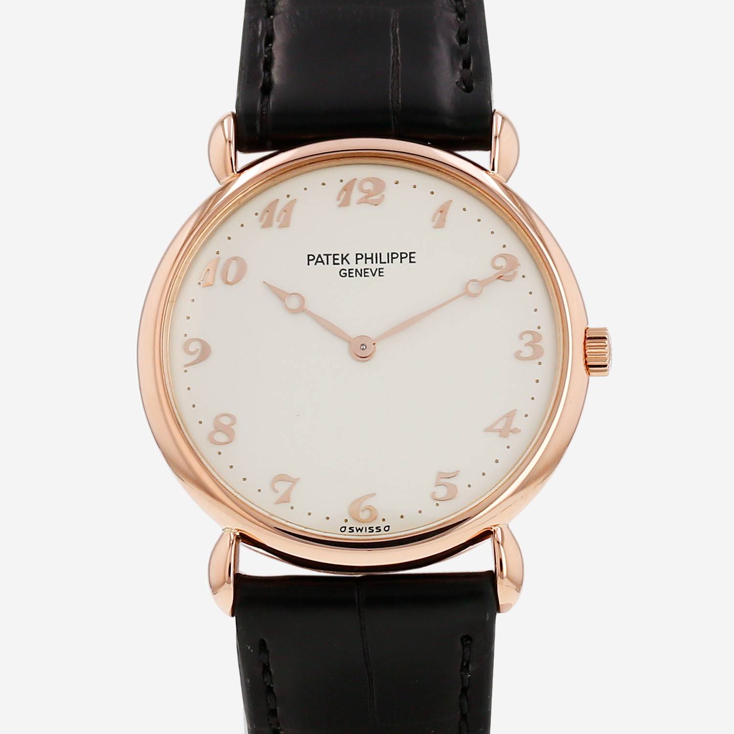 Pink gold Patek Philippe Calatrava wristwatch. Round case in pink gold, clipped caseback, canned crown.