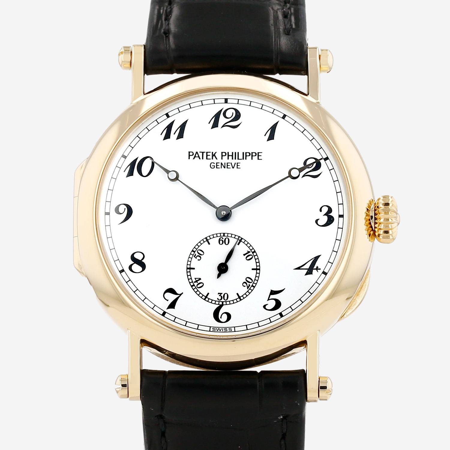 Yellow gold Patek Philippe Calatrava wristwatch. Round case in yellow gold, clipped caseback, canned crown.