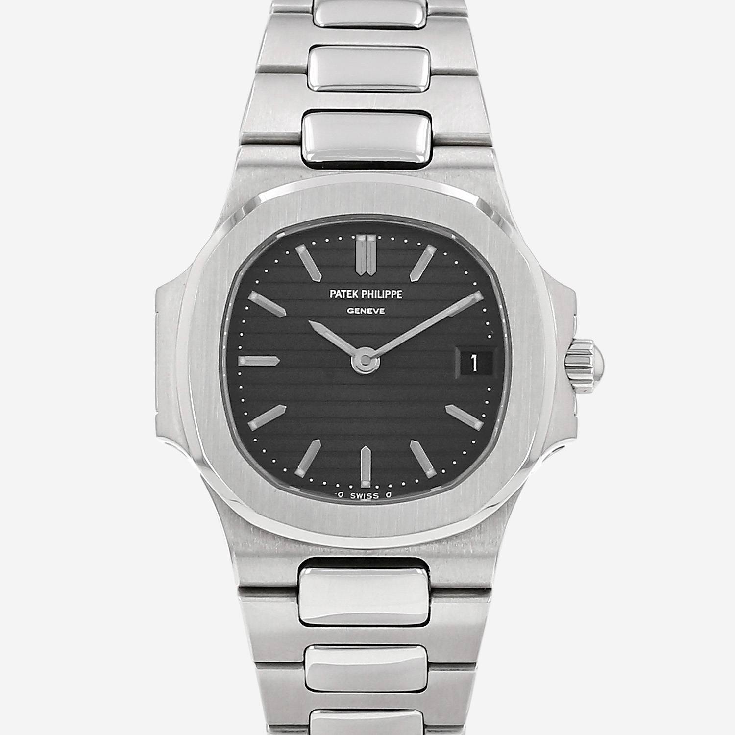 Stainless steel Patek Philippe Nautilus wristwatch. Cushion case in stainless steel, clipped caseback, smooth bezel, canned crown.
