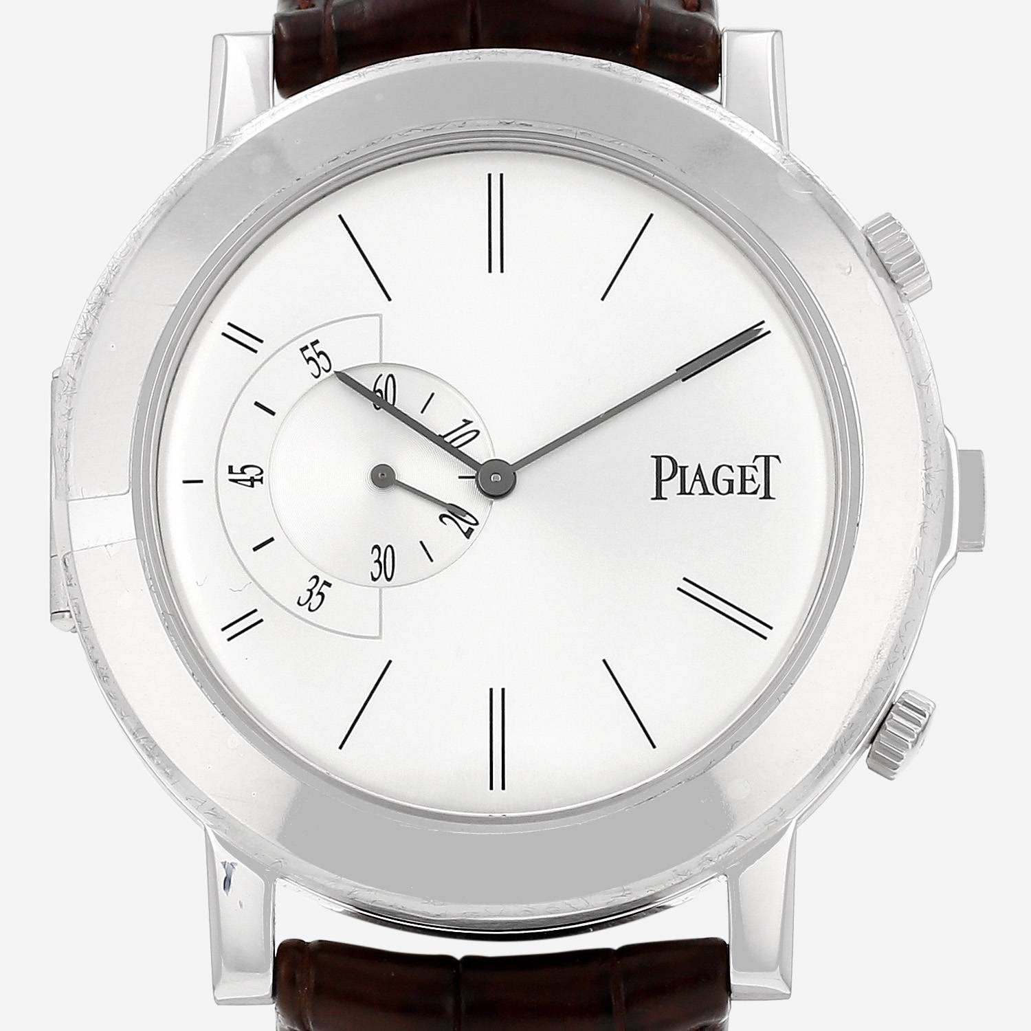 White gold Piaget Altiplano wristwatch. Round case in white gold reversible, screwed caseback, canned crown.