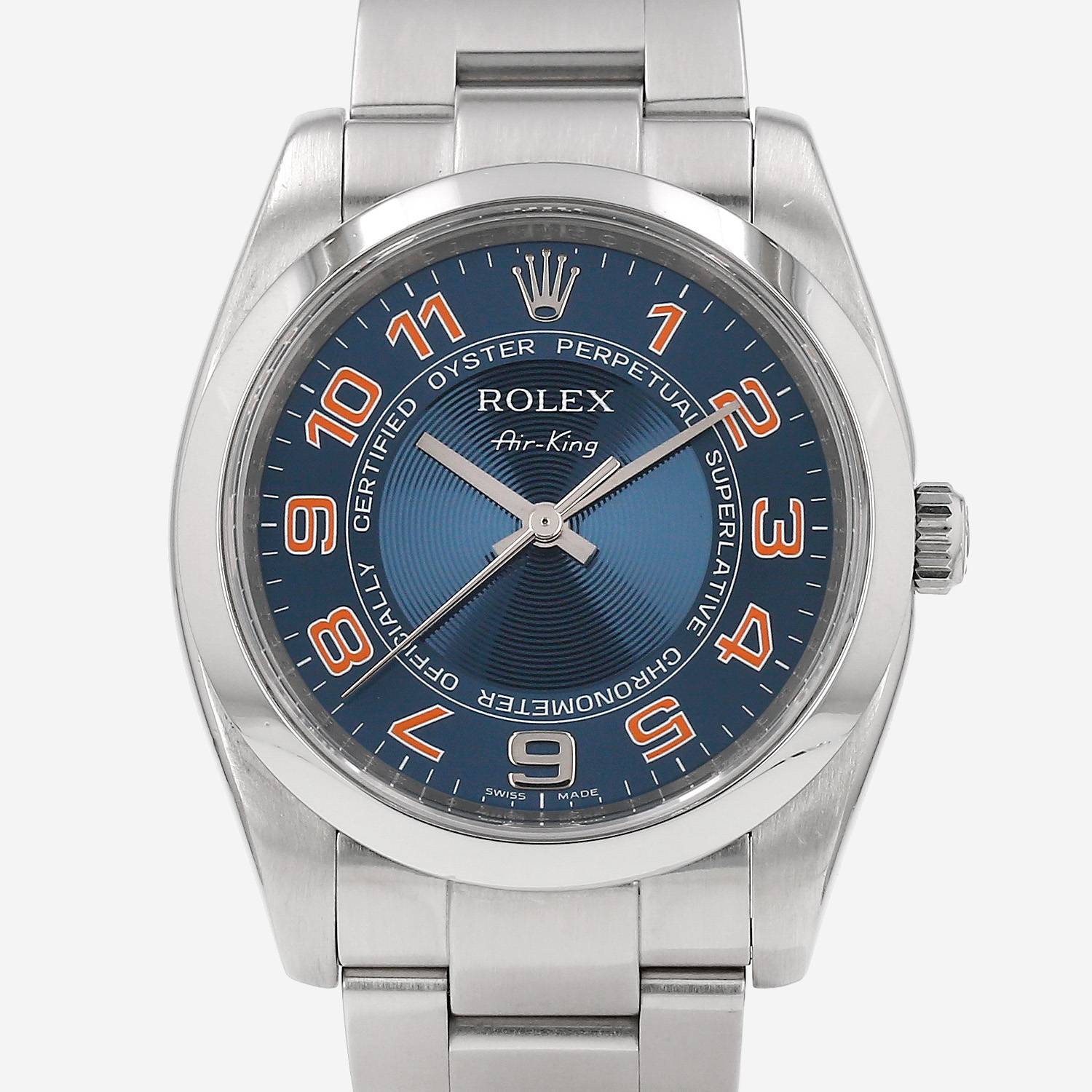 Stainless steel Rolex Air King wristwatch. Round case in stainless steel, screwed caseback, stainless steel smooth bezel, screw-down crown.