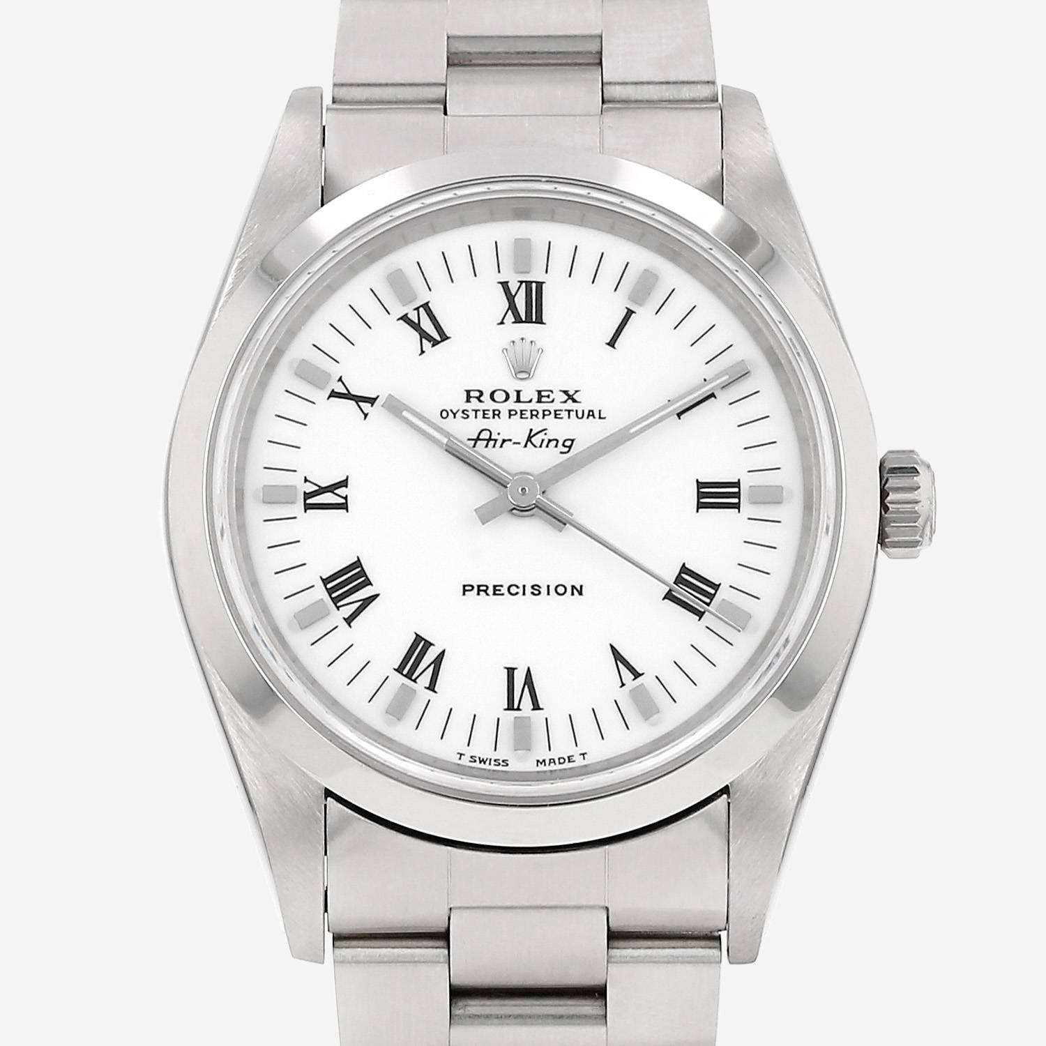 Stainless steel Rolex Air King wristwatch. Round case in stainless steel, screwed caseback, stainless steel smooth bezel, screw-down crown.