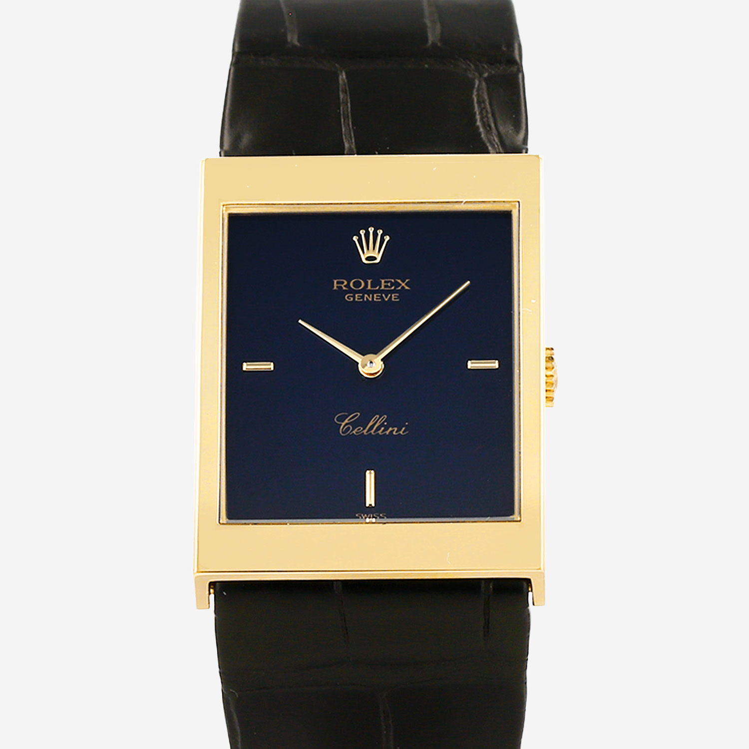Yellow gold Rolex Cellini wristwatch. Rectangular case in yellow gold, clipped caseback, canned crown.