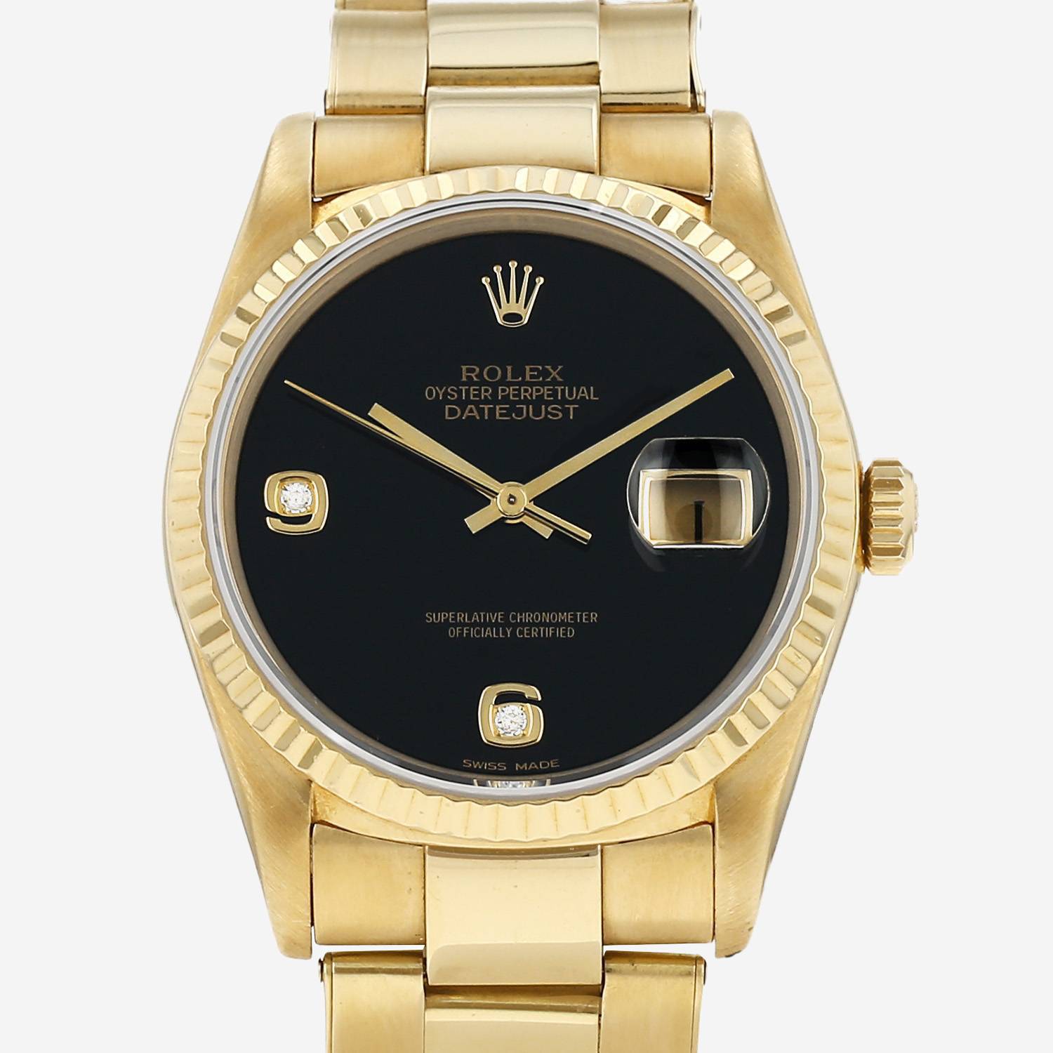 Yellow gold Rolex Datejust wristwatch. Round case in yellow gold, screwed caseback, yellow gold striated bezel, screw-down crown.