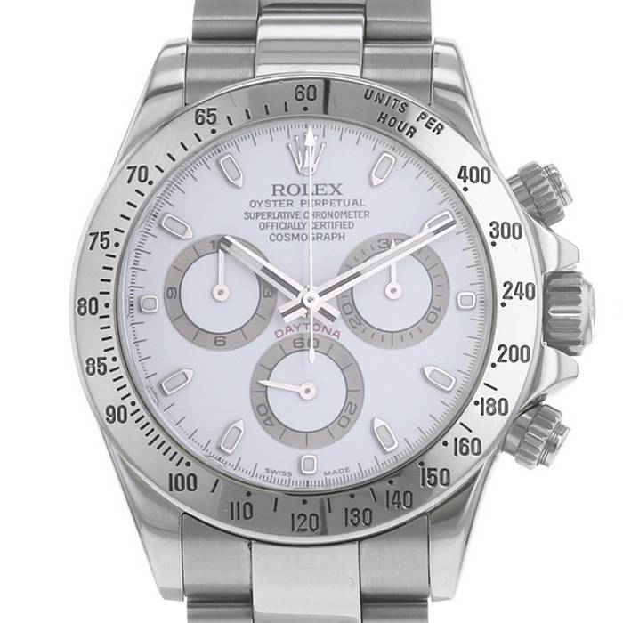 Stainless steel Rolex Daytona wristlet chronograph. Round case in stainless steel, screwed caseback, screwed bezel, stainless steel graduated bezel, screw-down crown.