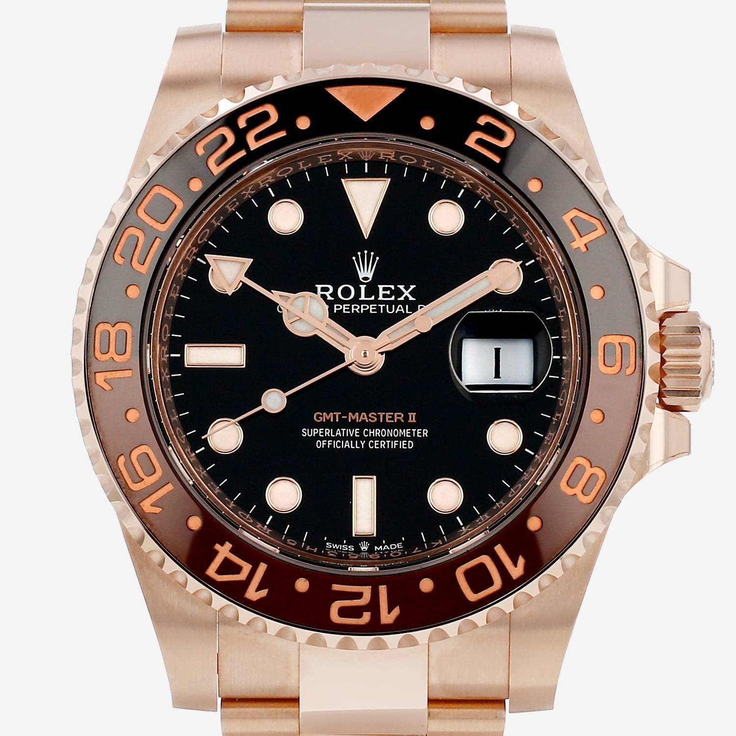 Pink gold Rolex GMT-Master II wristwatch. Round case in pink gold, screwed caseback, 24 hours graduated rotating bezel, screw-down crown.