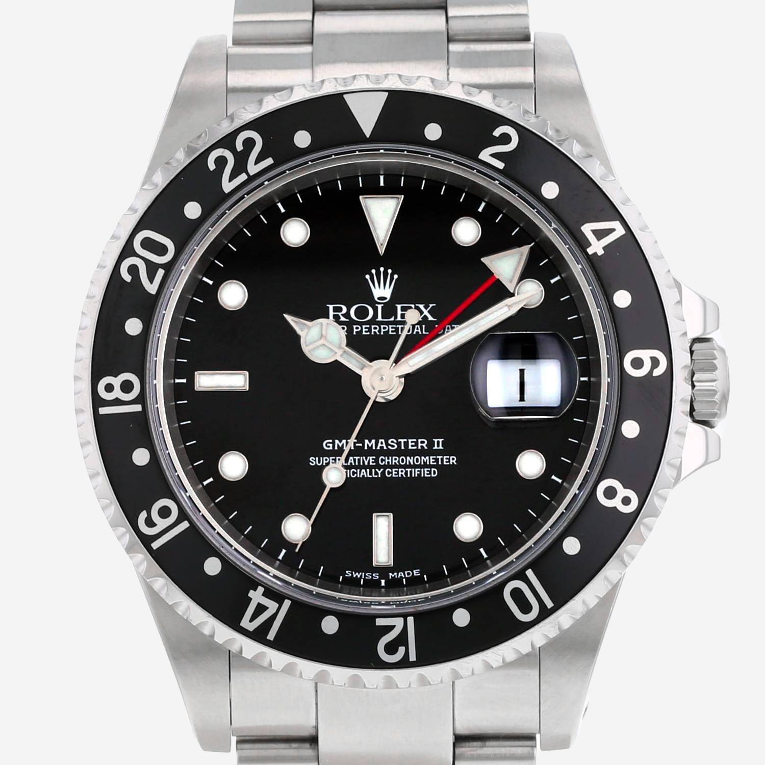 Stainless steel Rolex GMT-Master II wristwatch. Round case in stainless steel, screwed caseback, 24 hours graduated rotating bezel, screw-down crown.