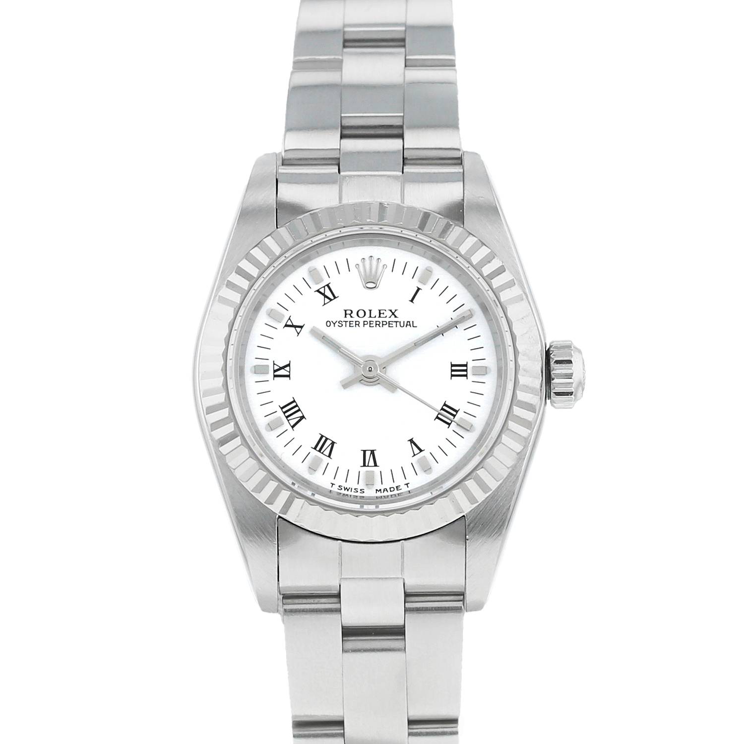 Gold and stainless steel Rolex Lady Oyster Perpetual wristwatch. Round case in stainless steel, screwed caseback, white gold striated bezel, screw-down crown.