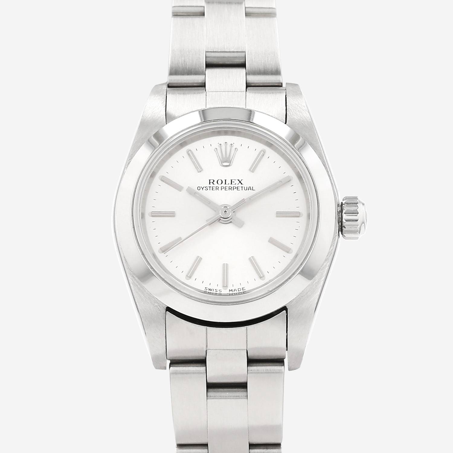 Stainless steel Rolex Lady Oyster Perpetual wristwatch. Round case in stainless steel, screwed caseback, smooth bezel, screw-down crown.