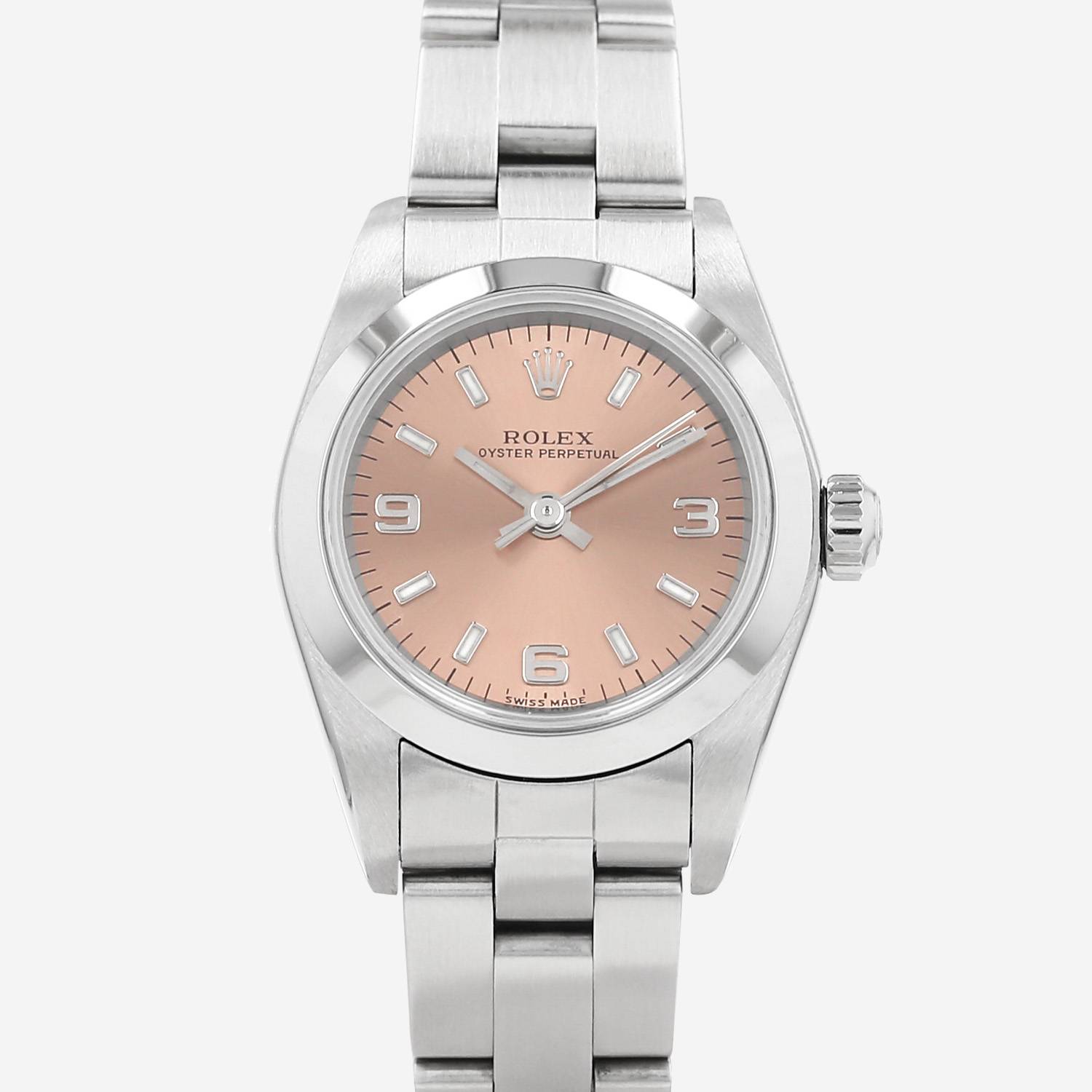 Stainless steel Rolex Lady Oyster Perpetual wristwatch. Round case in stainless steel, screwed caseback, smooth bezel, screw-down crown.