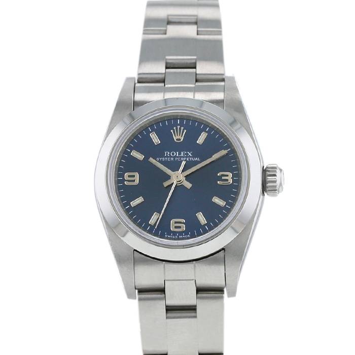 Stainless steel Rolex Lady Oyster Perpetual wristwatch. Round case in stainless steel, screwed caseback, stainless steel smooth bezel, screw-down crown.