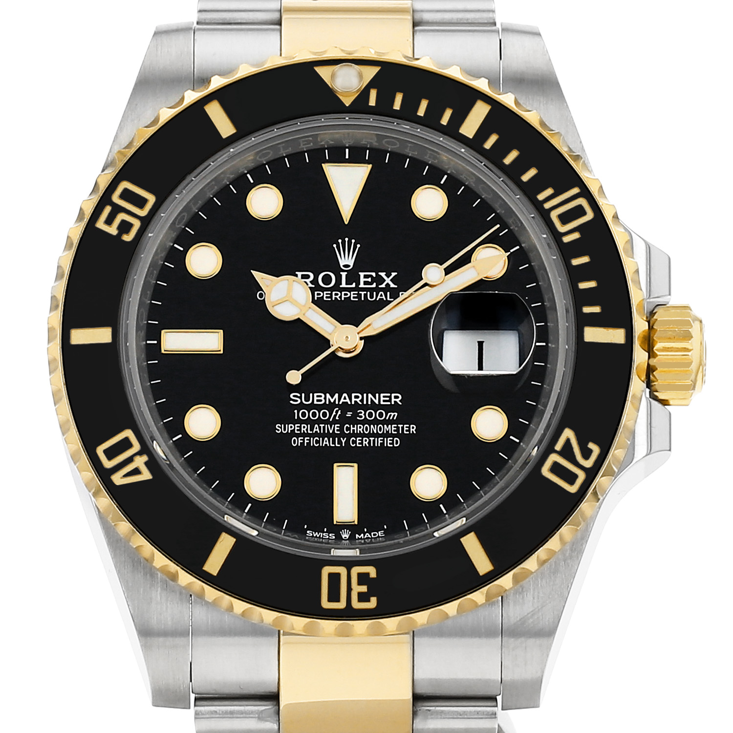 Gold and stainless steel Rolex Submariner Date wristwatch. Round case in gold and stainless steel, screwed caseback, directional graduating rotating bezel, screw-down crown.