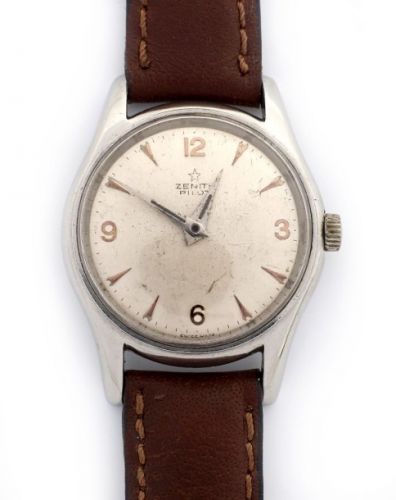 Description : MONTRE ZÉNITH PILOT en acier argenté avec chiffres 12,3,6,9, cuivrés et appliqués, mouvement mécanique remontage manuel (circa 60), calibre 120, n°de série 4412275, bracelet en cuir marron sur boucle ardillon -