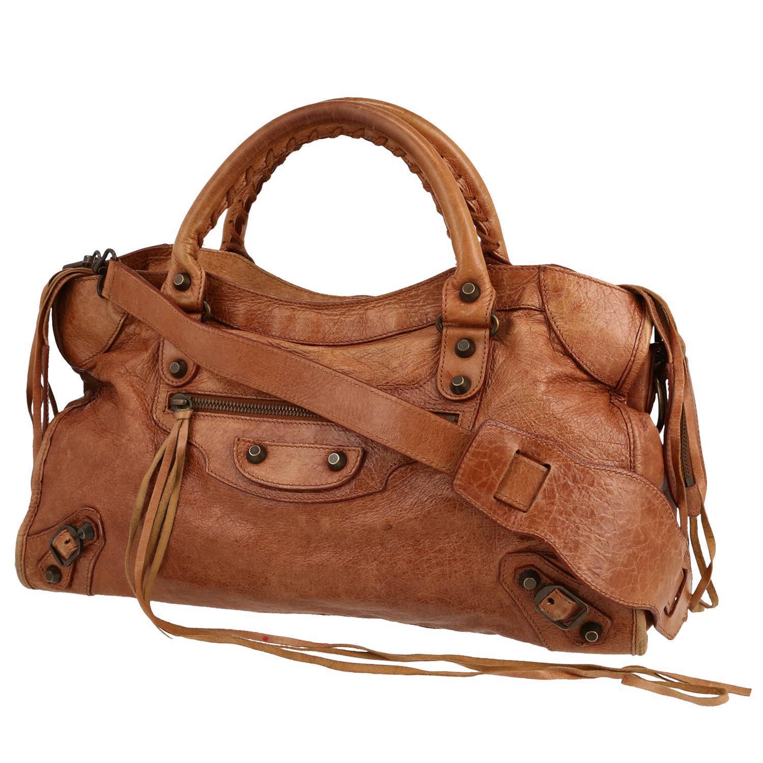 Práctico bolso de mano Balenciaga City de cuero usado marrón, adorno en metal negro, doble asa de cuero trenzado marrón, una bandolera extraíble de cuero usado marrón para llevar en la mano o al hombro.