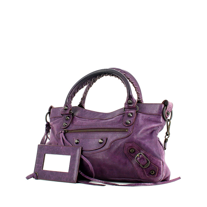 Elegante bolso de mano Balenciaga Classic City de cuero violeta, adorno en metal cromado, doble asa de cuero trenzado violeta, asa sencilla de cuero violeta para llevar en la mano o al hombro.