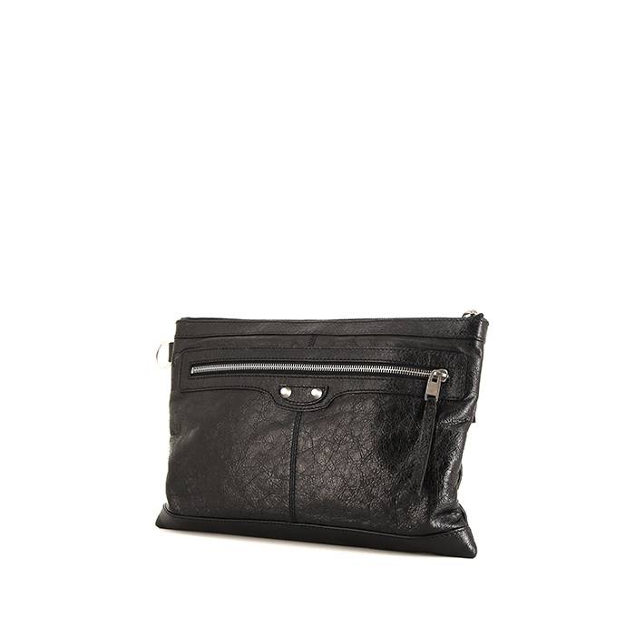 Elegante bolsito de mano Balenciaga Clip M de cuero negro, adorno en metal plateado, llevar en la mano.