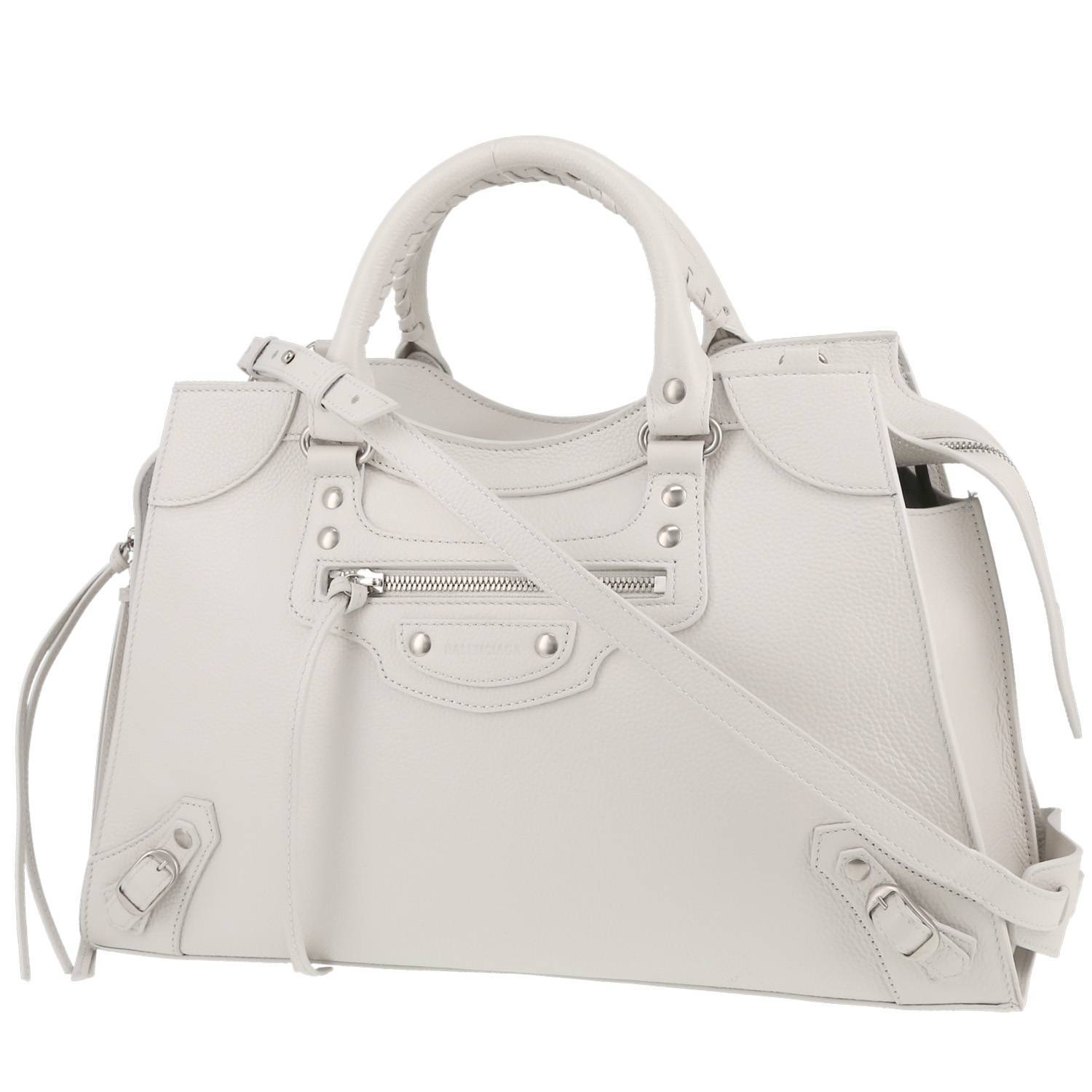 Inconfundible bolso de mano Balenciaga Neo Classic de cuero granulado blanco, adorno en metal plateado, doble asa de cuero blanco, bandolera extraíble y ajustable de cuero blanco para llevar en la mano o colgado al hombro o cruzado.