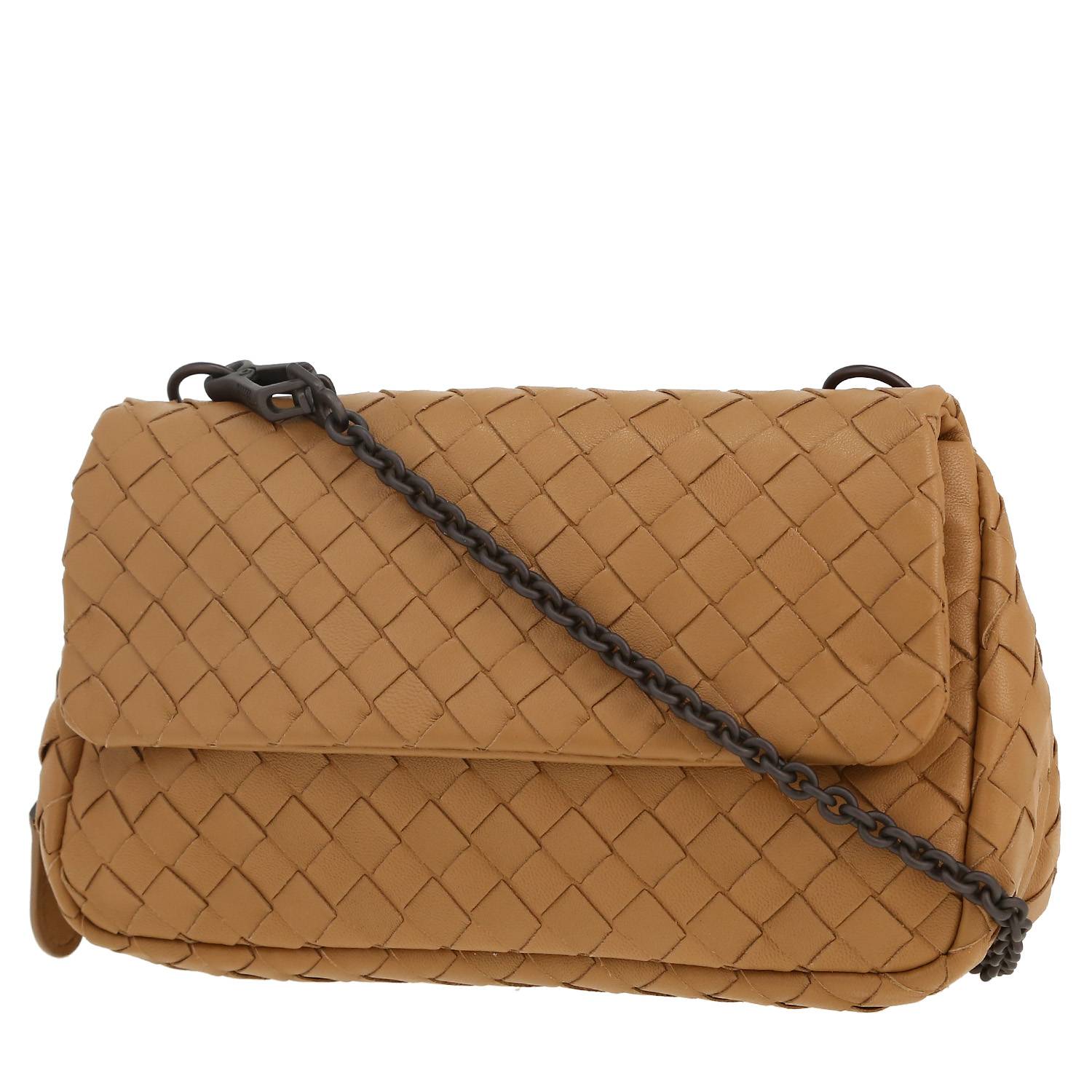 Magnífico bolso bandolera Bottega Veneta de cuero intrecciato marrón, adorno en metal negro, una asa en cadena de metal negro.