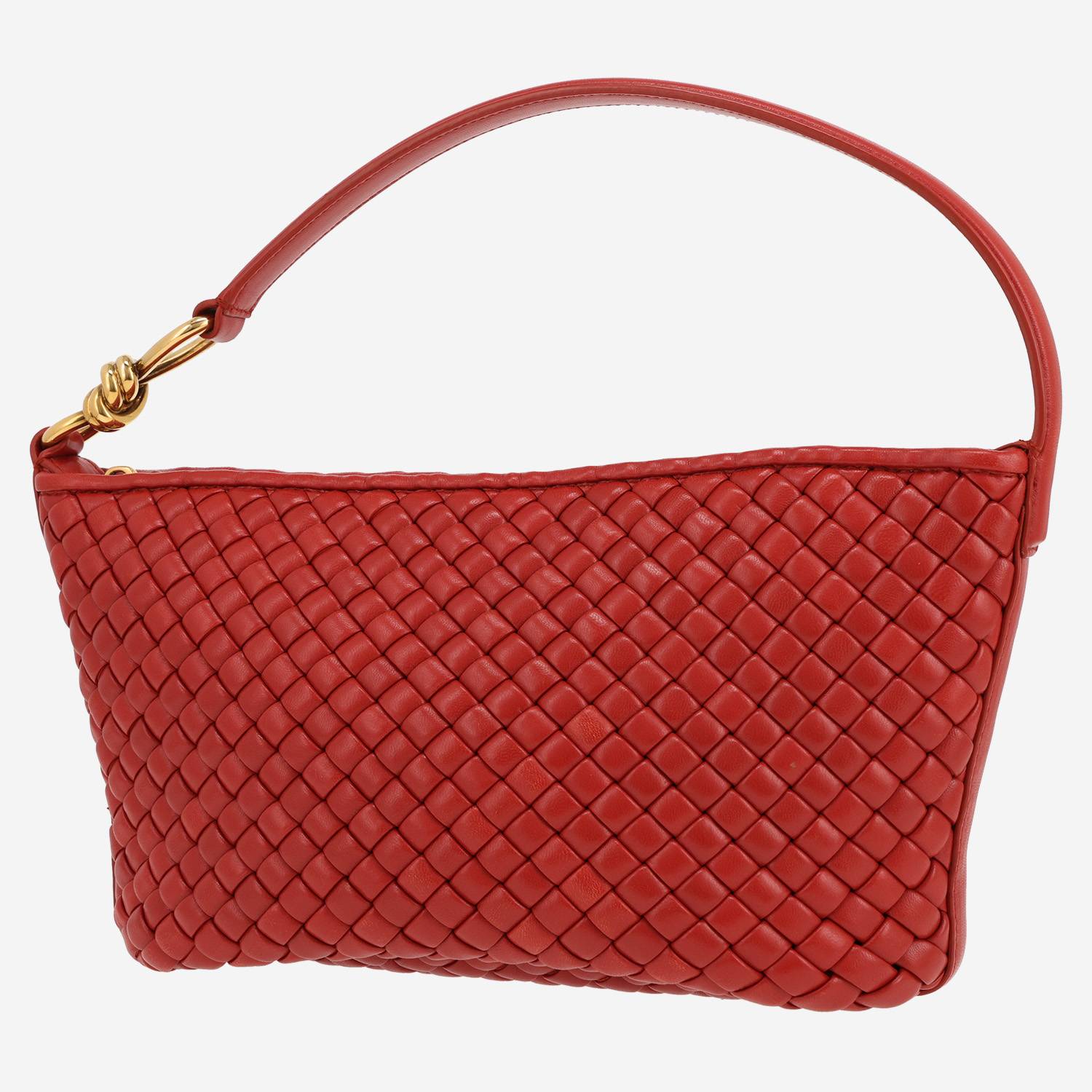 Magnífico bolso de mano Bottega Veneta de cuero intrecciato rojo, adorno en metal dorado, una asa de cuero rojo para llevar en la mano o al hombro.