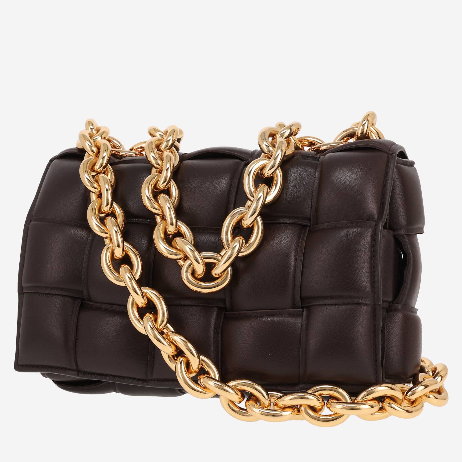 Magnífico bolso bandolera Bottega Veneta Cassette de cuero intrecciato marrón, adorno en metal dorado, asa sencilla de metal dorado, una asa en cadena de metal dorado para llevar en la mano o colgado al hombro o cruzado.