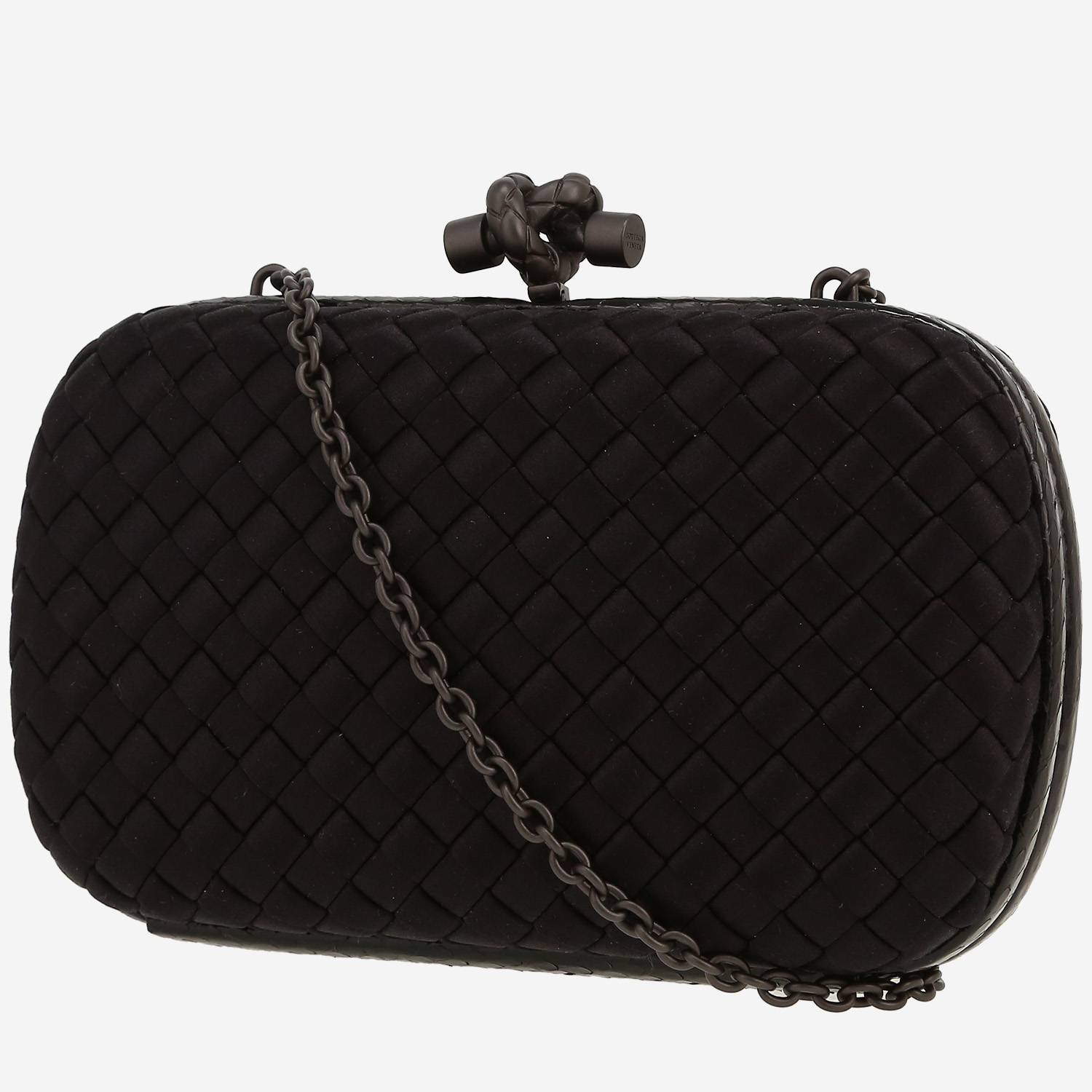 Magnífica bolso joya Bottega Veneta Knot de satén negro y piel de pitón negra, adorno en metal negro, una asa en cadena de metal negro para llevar en la mano o colgado al hombro o cruzado.