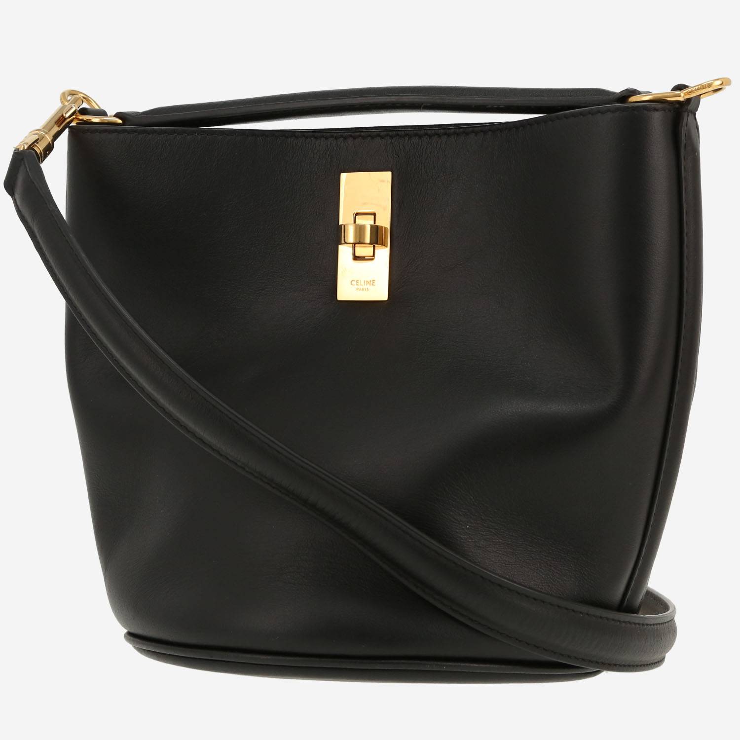 Magnífico bolso bandolera Celine Seau 16 modelo pequeño de cuero negro, adorno en metal dorado, asa sencilla de cuero negro, bandolera extraíble de cuero negro para llevar en la mano o colgado al hombro o cruzado.