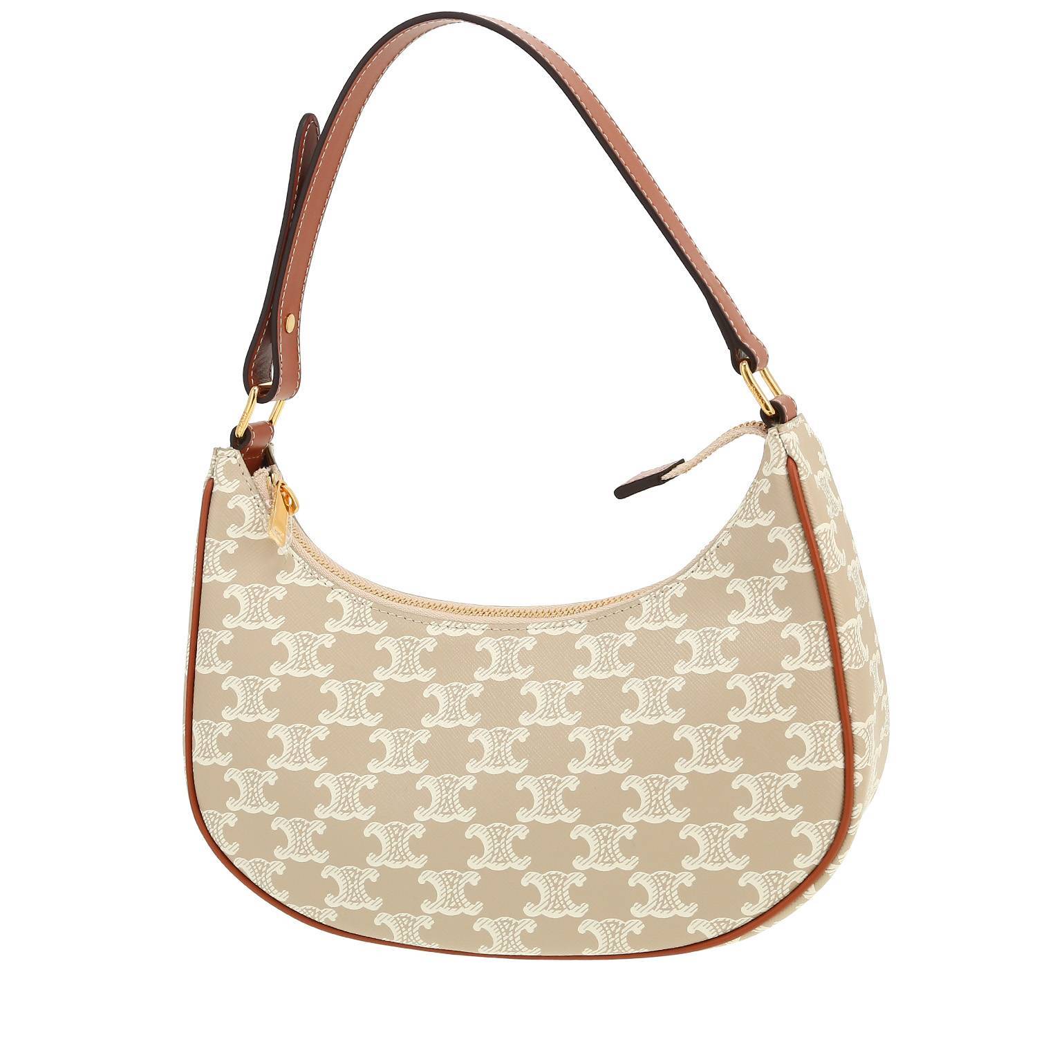 Bonito y codiciado bolso de mano Celine Ava modelo mediano de tejido "Triomphe" beige y cuero marrón, adorno en metal dorado, asa ajustable con 3 niveles de cuero marrón para llevar en la mano o al hombro.