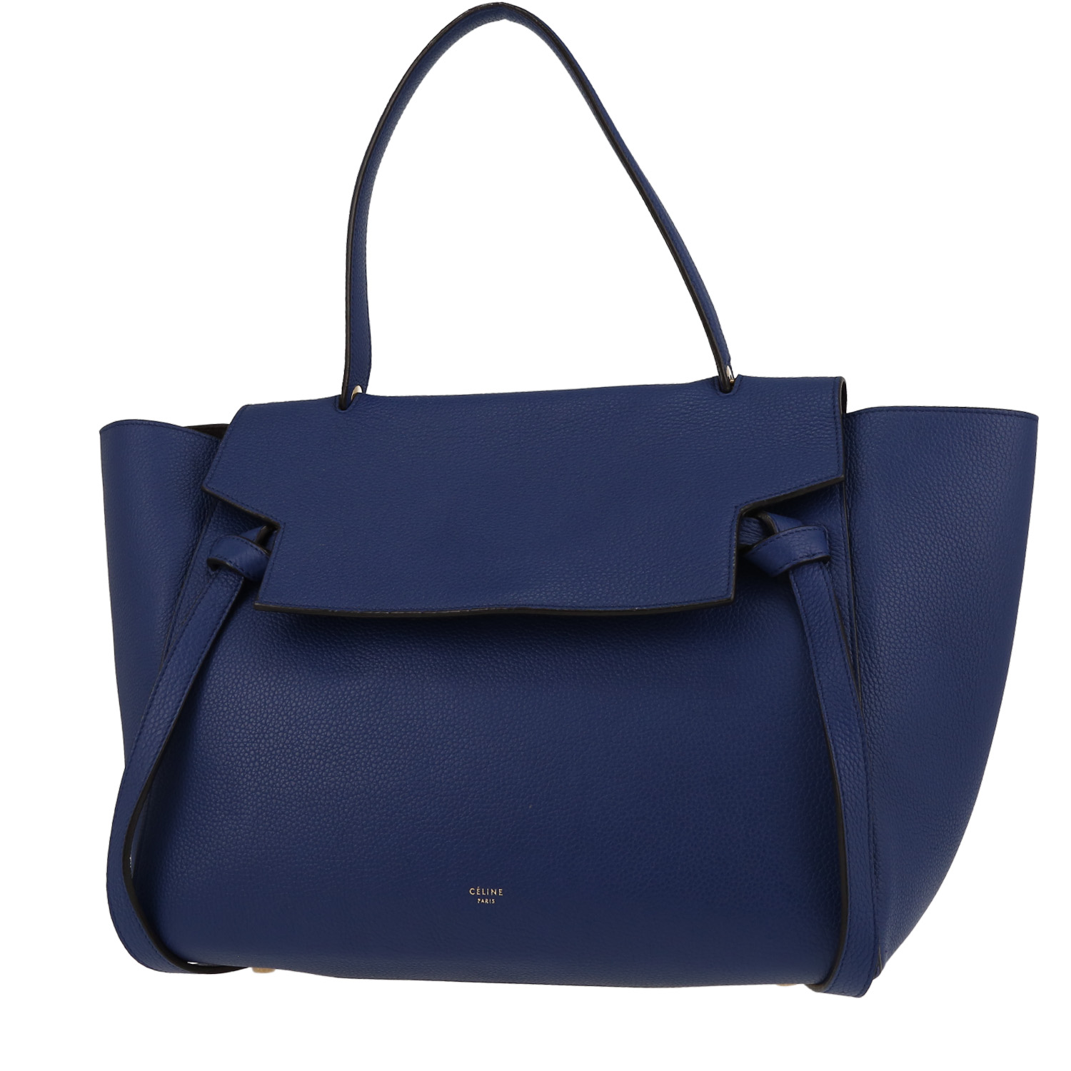 Elegante bolso de mano Celine Belt modelo mediano de cuero granulado azul, adorno en metal dorado, asa sencilla de cuero azul para llevar en la mano o al hombro.