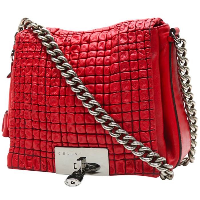 Sorprendente bolso de mano Celine de cuero rojo, adorno en metal plateado, una asa sencilla de metal plateado para llevar en la mano o al hombro.