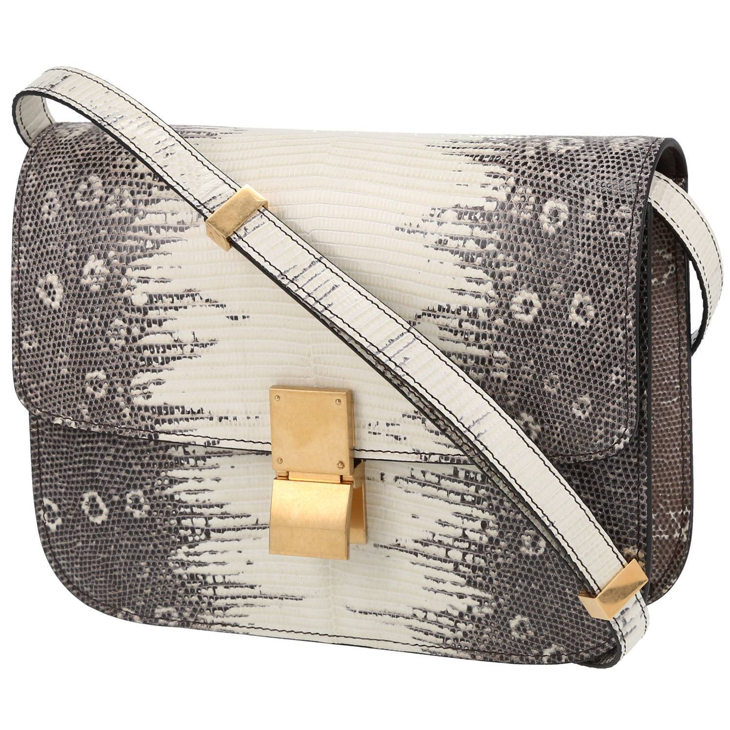 Magnífico bolso bandolera Celine Classic Box de piel de lagarto beige gris, adorno en metal dorado, una asa ajustable de piel de lagarto para llevar al hombro o cruzado.