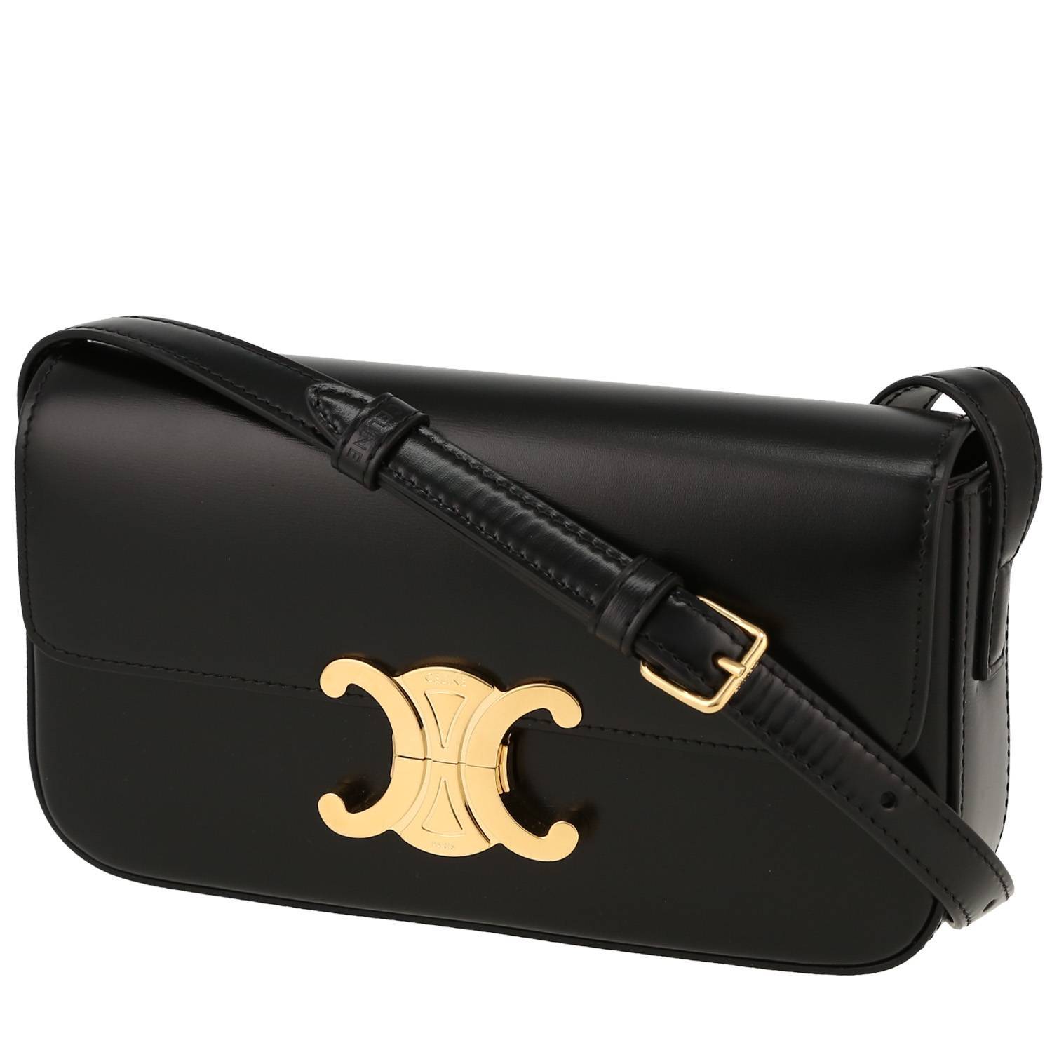 Encantador bolso de mano Celine Claude de cuero negro, adorno en metal dorado, una asa sencilla ajustable de cuero negro para llevar en la mano o al hombro.