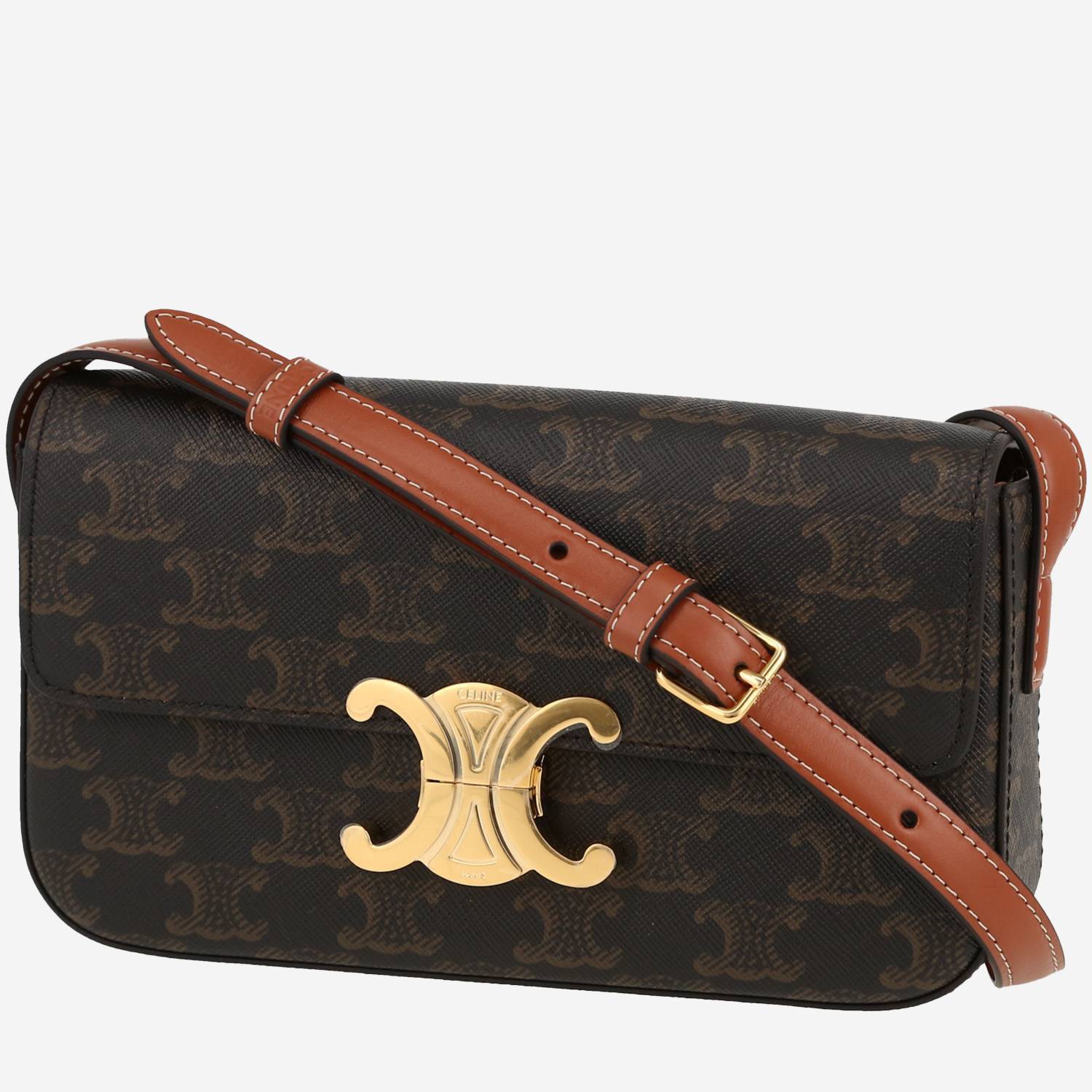 Inconfundible bolso de mano Celine Claude de tejido "Triomphe" y cuero marrón, adorno en metal dorado, una asa ajustable de cuero marrón para llevar en la mano o al hombro.