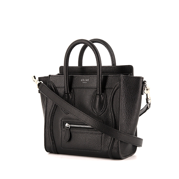 Encantador bolso bandolera Celine Luggage Mini de cuero negro, adorno en metal plateado, doble asa de cuero negro, una bandolera extraíble de cuero negro para llevar en la mano o colgado al hombro o cruzado.