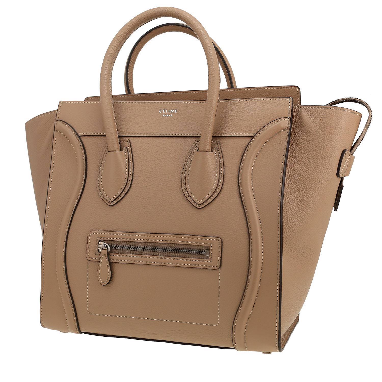 Inconfundible bolso de mano Celine Luggage modelo mediano de cuero color topo, adorno en metal plateado negro, doble asa de cuero color topo para llevar en la mano.