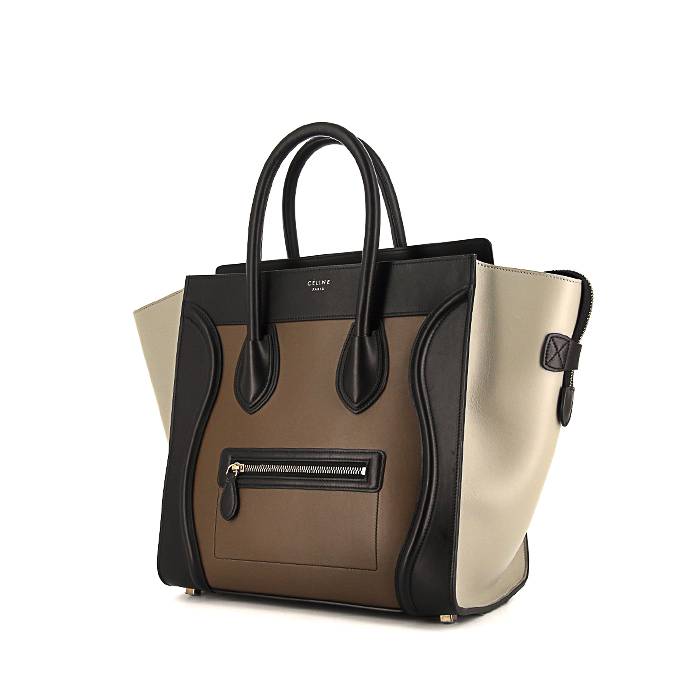 Elegante bolso de mano Celine Luggage modelo mediano de cuero marrón, negro y gris, adorno en metal dorado, doble asa de cuero negro para llevar en la mano.