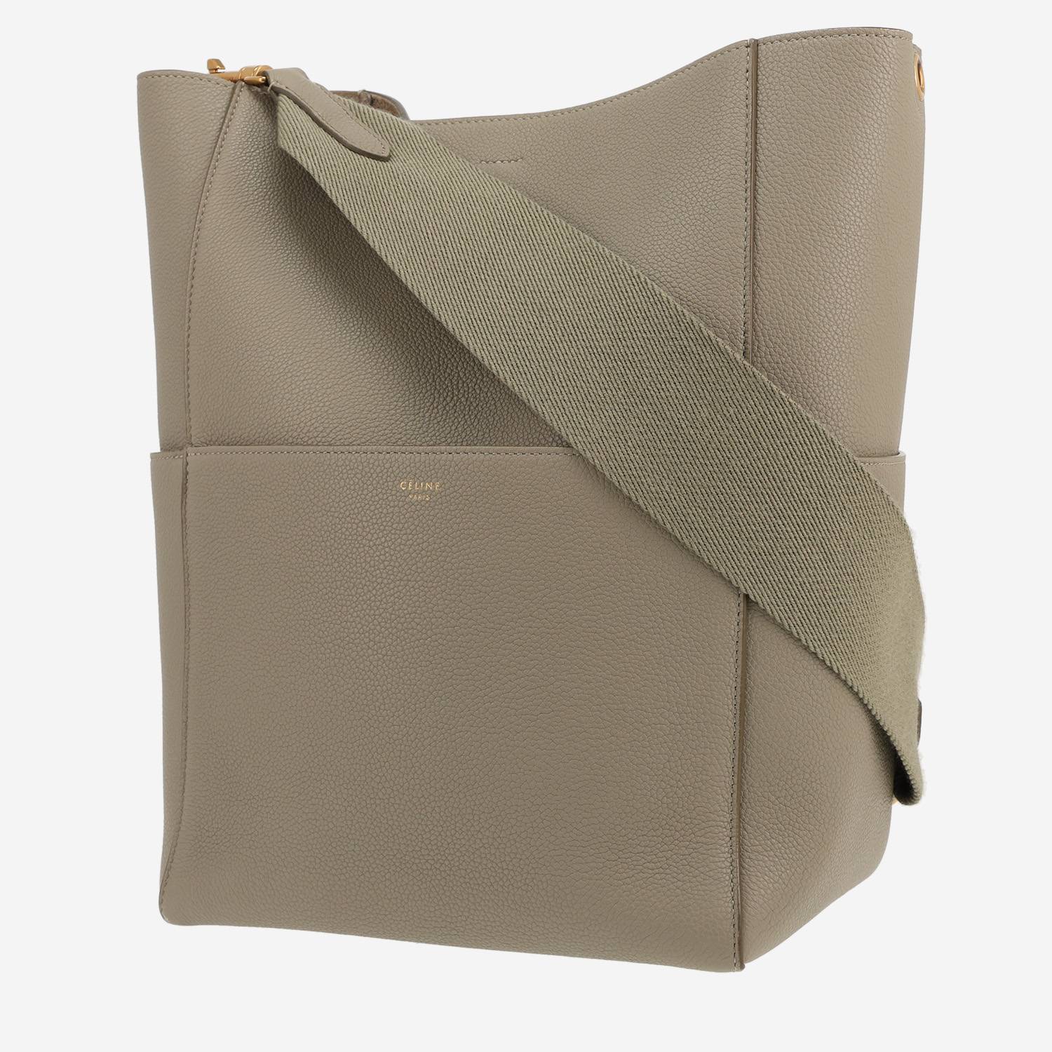 Inconfundible bolso de mano Celine Sac Sangle de cuero granulado verde Sauge, adorno en metal dorado, una asa extraíble de lona verde para llevar en la mano o al hombro.
